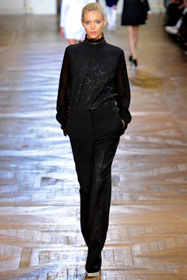 Stella McCartney creates clothing for this woman. Shirt dressing, skater skirts with oversized jumpers and tailored pants with intricate detailing in a palette of cobalt blue, black and white. This type of tailored power dressing that is still a touch feminine is perfect for the modern woman. McCartney manages to perfect it season after season and you can too.